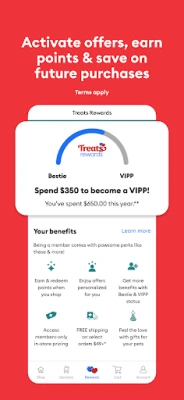 • Treats Rewards Loyalty Program: Sign up to earn points on every merchandise purchase, services appointment & PetSmart Charities® donation. Plus, manage your Treats Rewards account & tier status.