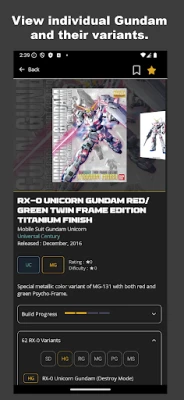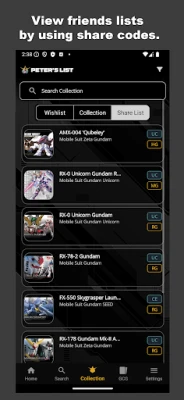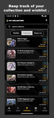 Keep track of your Gundam collection by adding searched Gundam to your collection or add it to your wish list for future purchases. Find Gundam by Model and filter by series and grades. View Gundam details which includes their timeline and variants. Share your list with your friends or family using share codes.